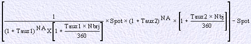 = Cours au comptant à la date de constatation = Cours à terme à la mise en place = Point de terme contractuel = Points de terme de marché pour la période référencée = Montant notionnel exprimé dans la devise de référence |